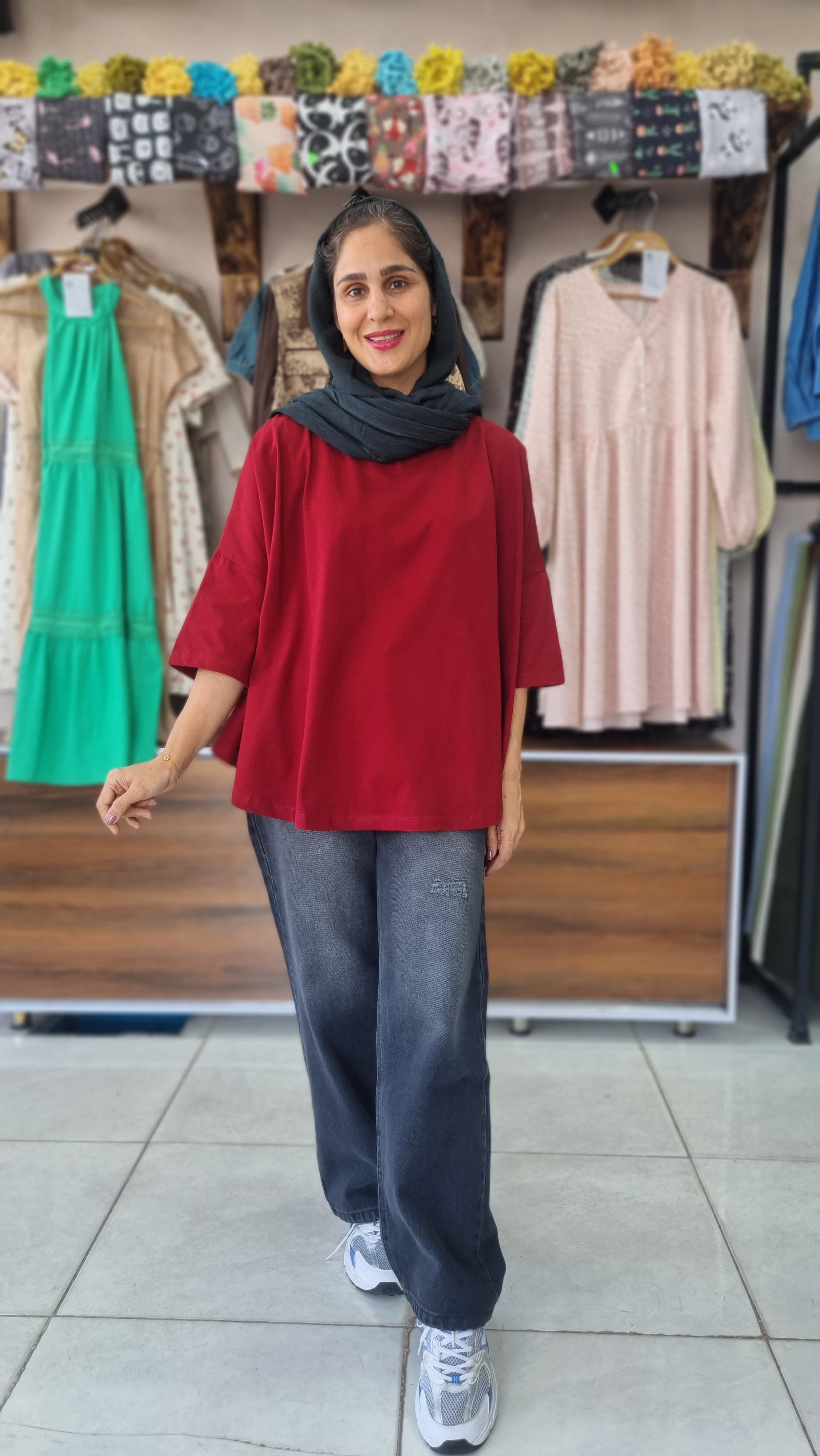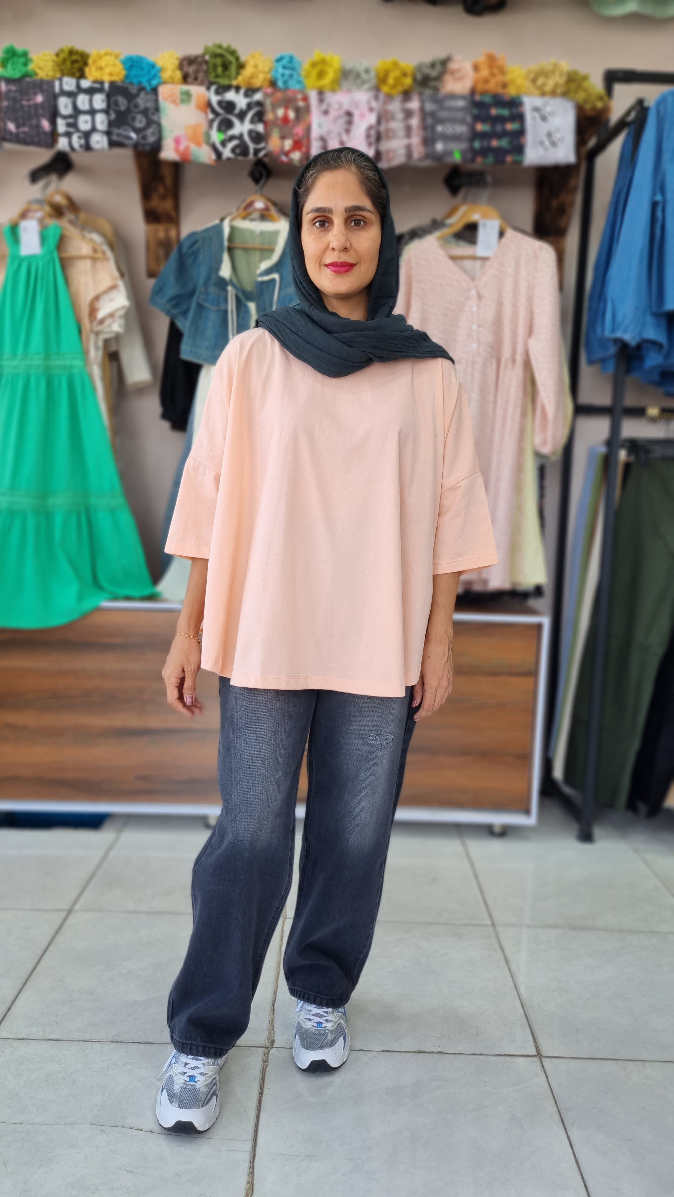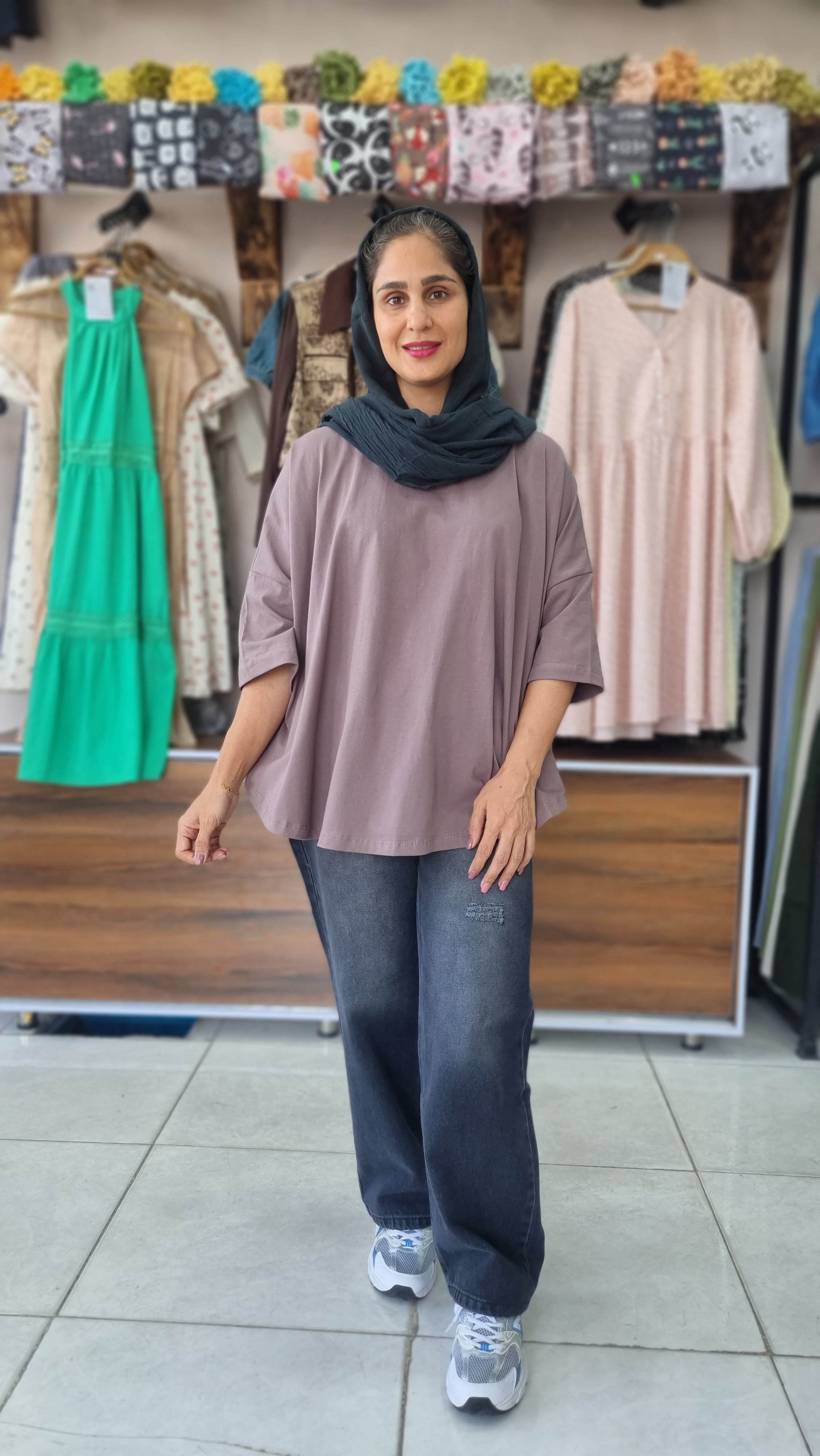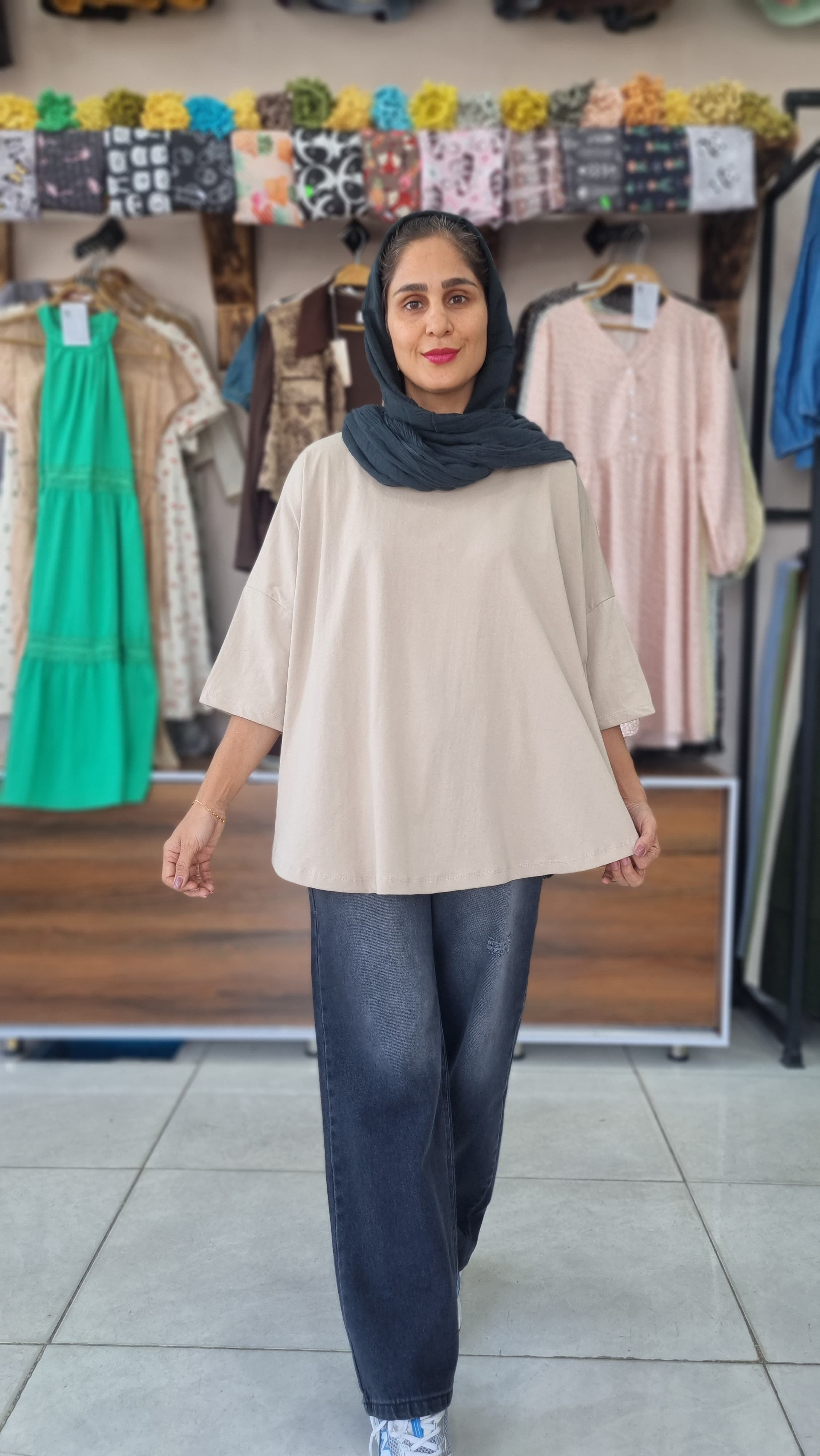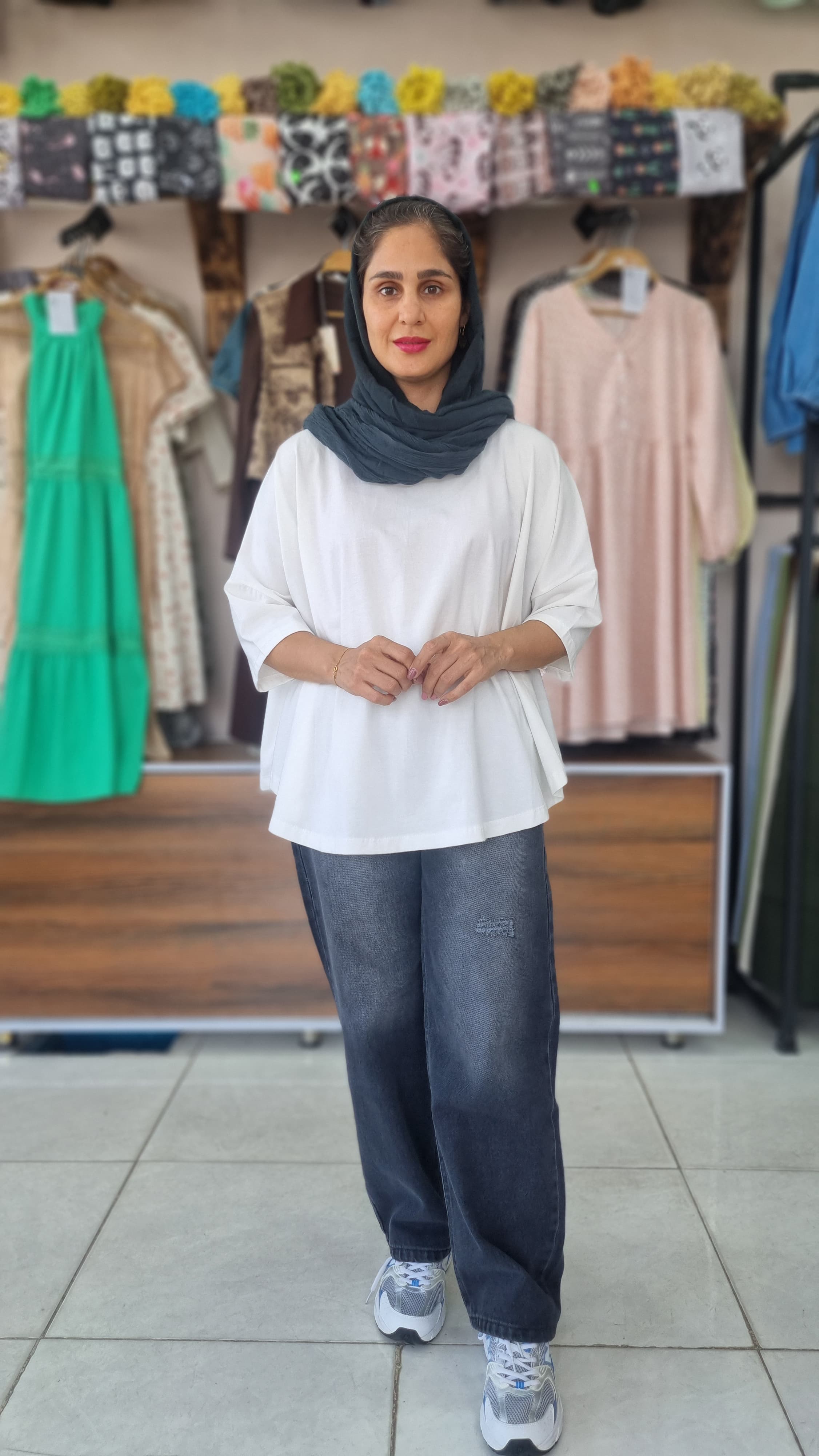 دور سینه ۱۶۶ ، دور کمر و باسن کلوش و آزاد ، قد آستین از گوشه گردن ۴۸ ، قد تیشرت ۶۵