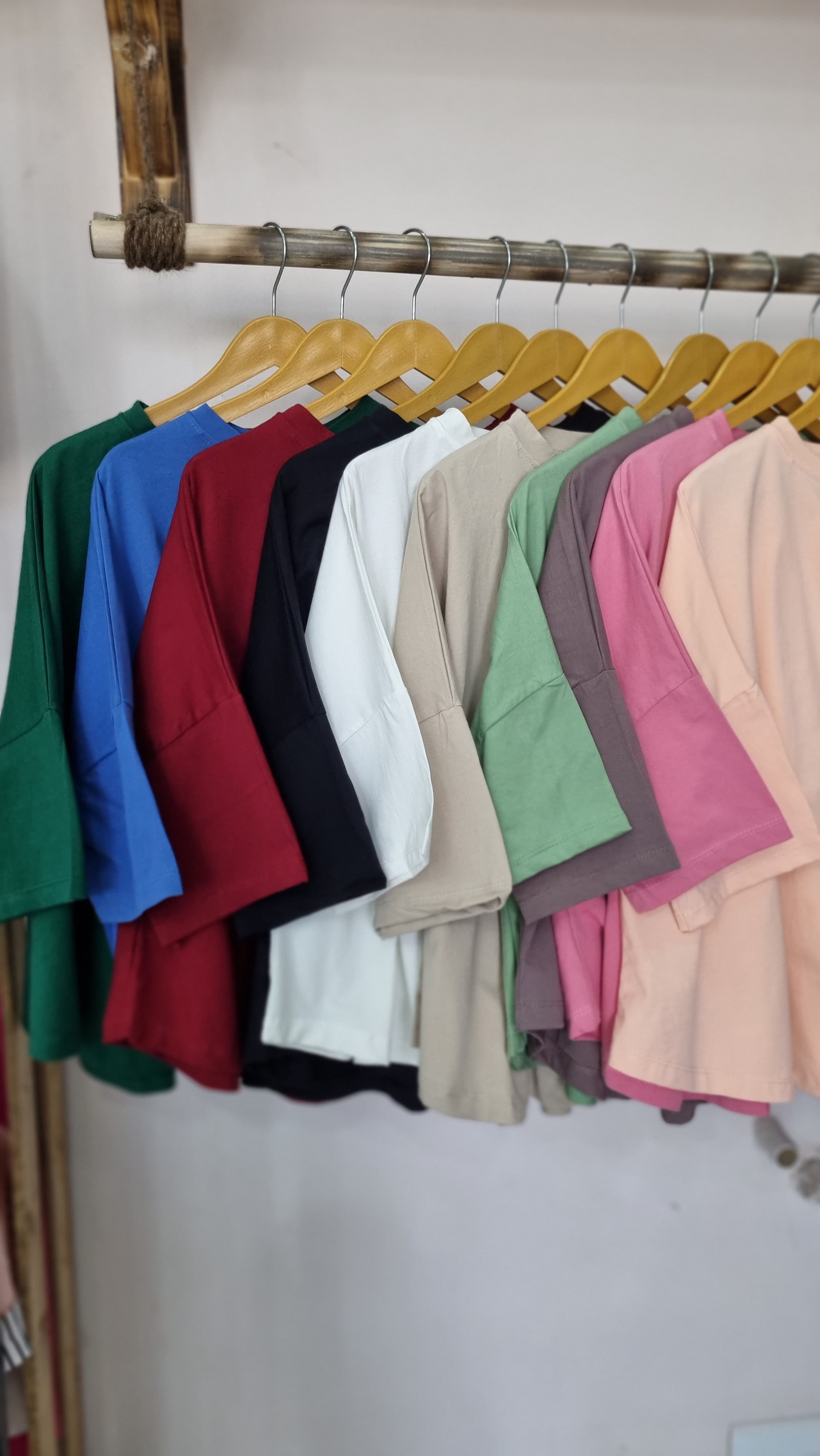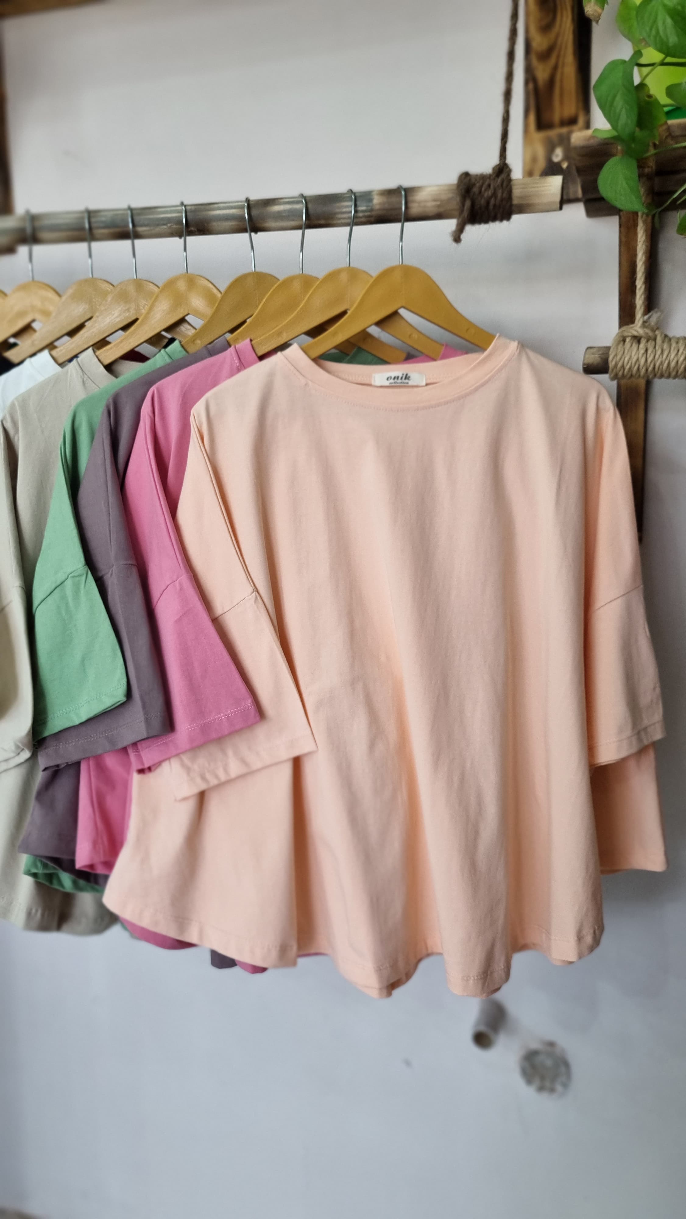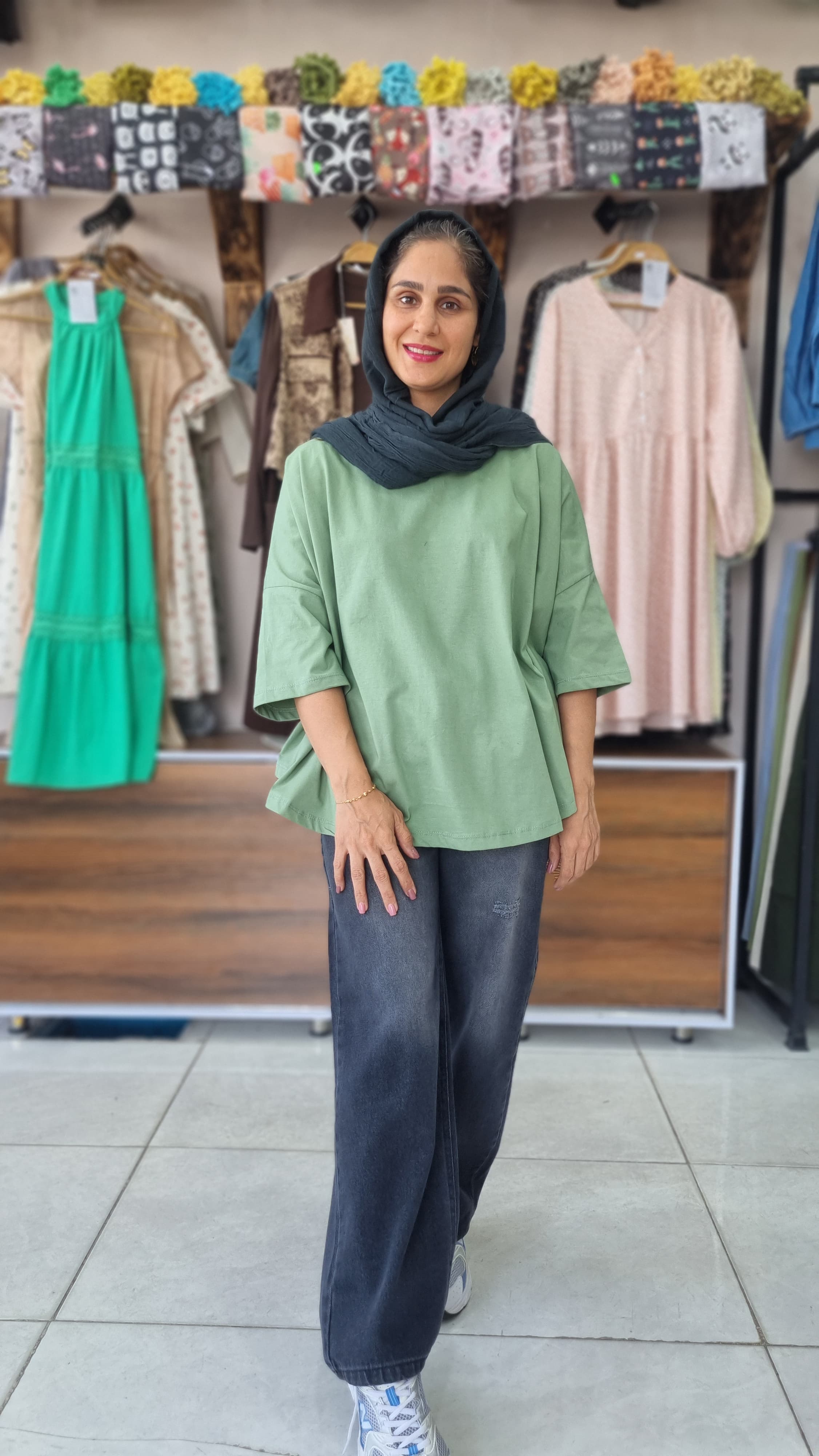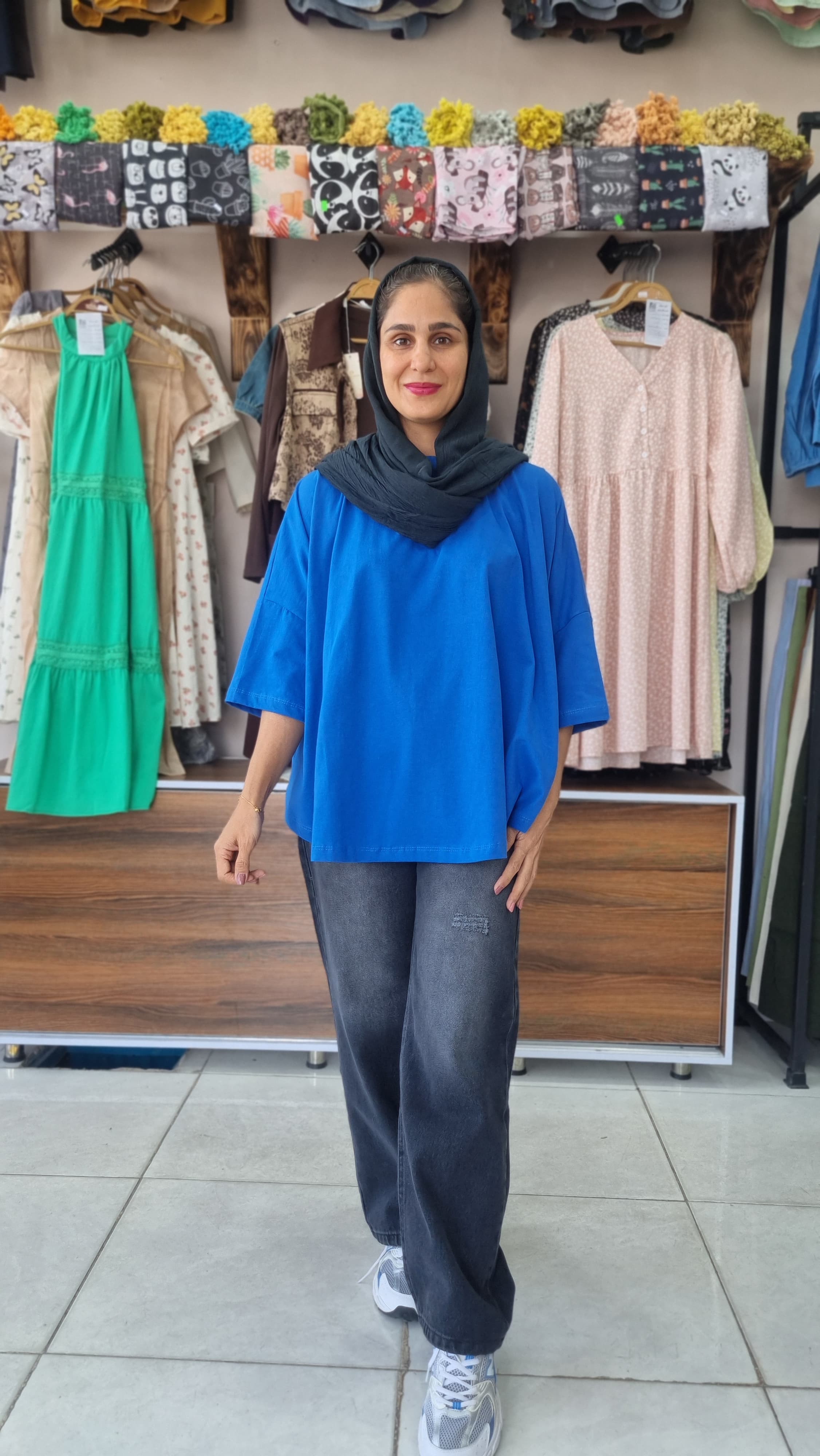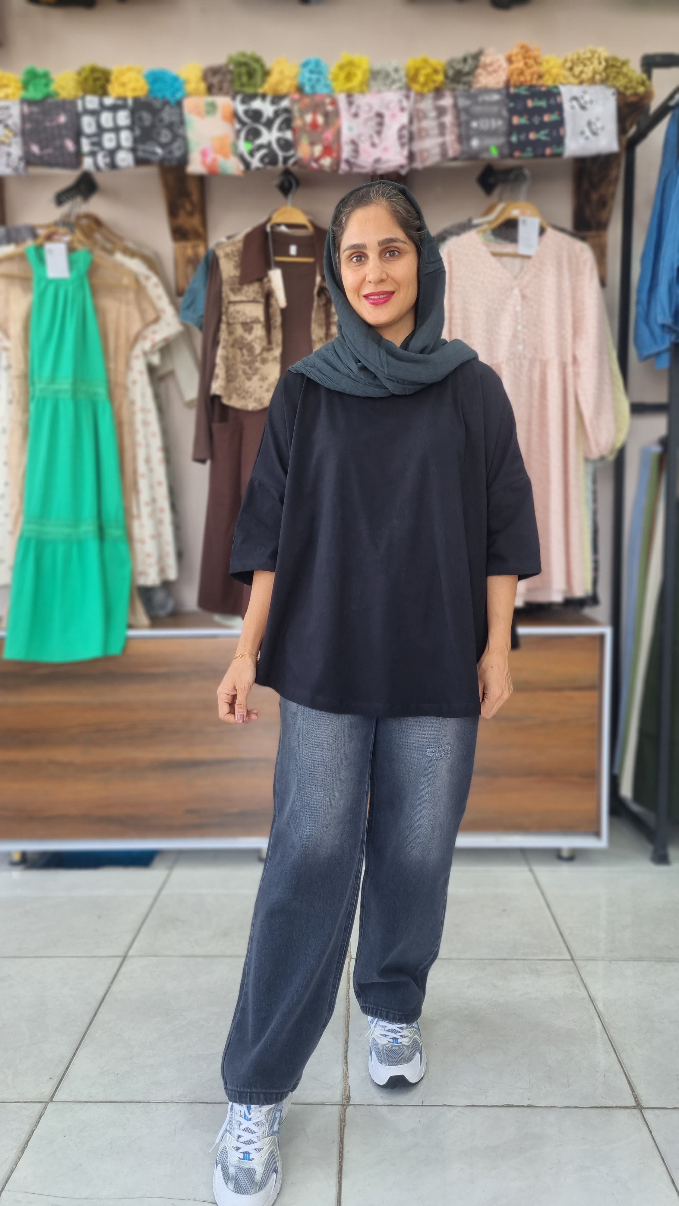 دور سینه ۱۶۶ ، دور کمر و باسن کلوش و آزاد ، قد آستین از گوشه گردن ۴۸ ، قد تیشرت ۶۵