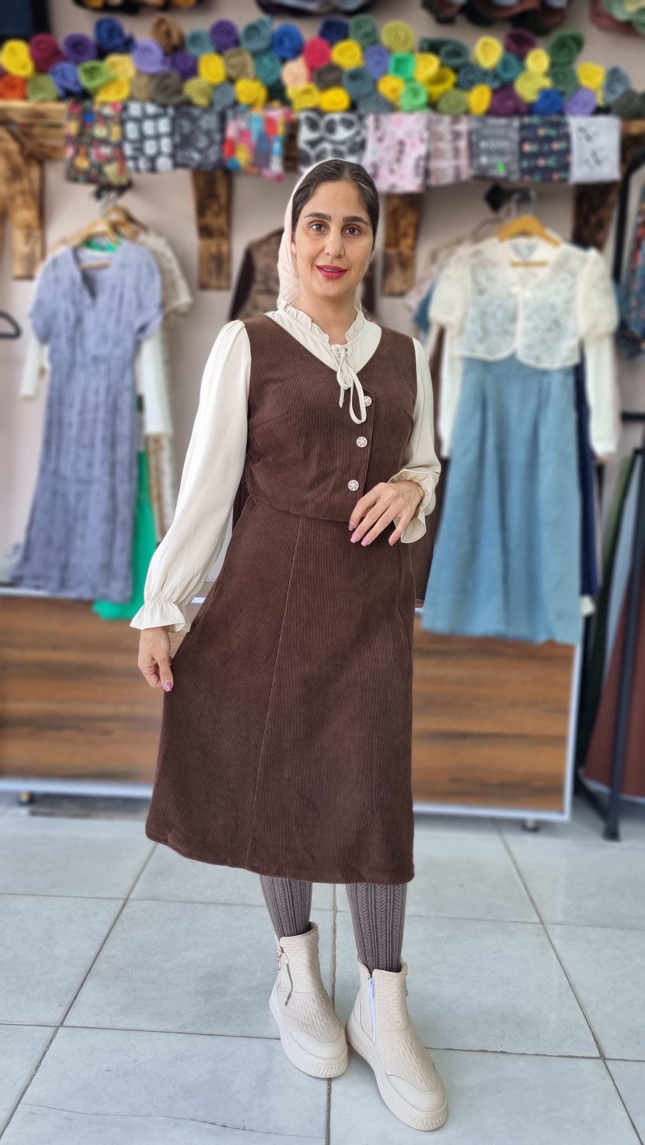 جنس ترکیبی مخمل کبریتی و کرپ وارداتی ، پیراهن وست که به هم وصل هستن ، دکمه ها نما هستند ، آستین ها کش دوزی ، یقه پیراهن چین خورده و بندینک دار ، پهلو پیراهن زیپ مخفی ، ۴ سایز ، مناسب ۳۶ تا ۳۶ ، حتما جدول سایز بندی رو قبل از ثبت سفارش چک کنید