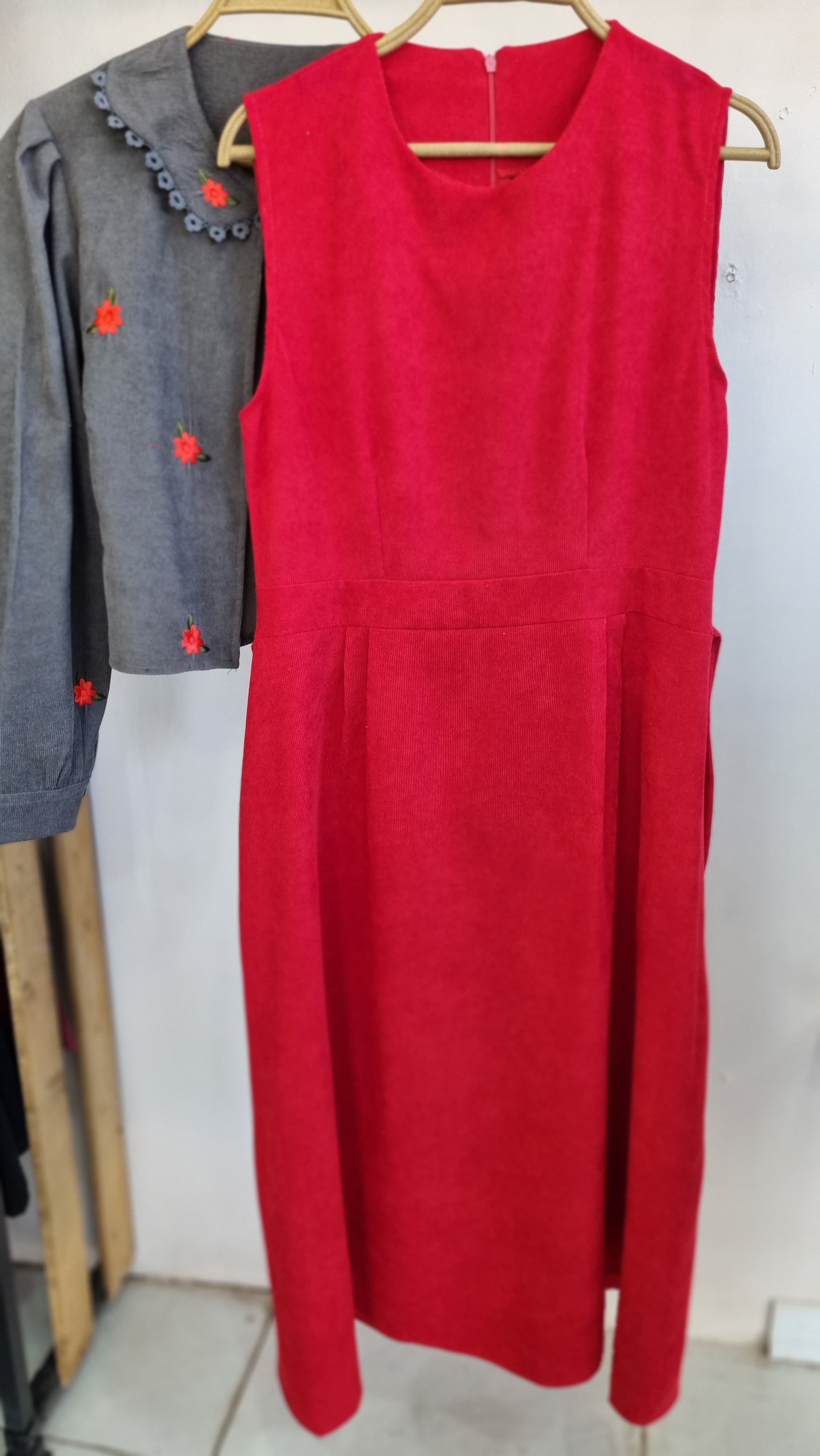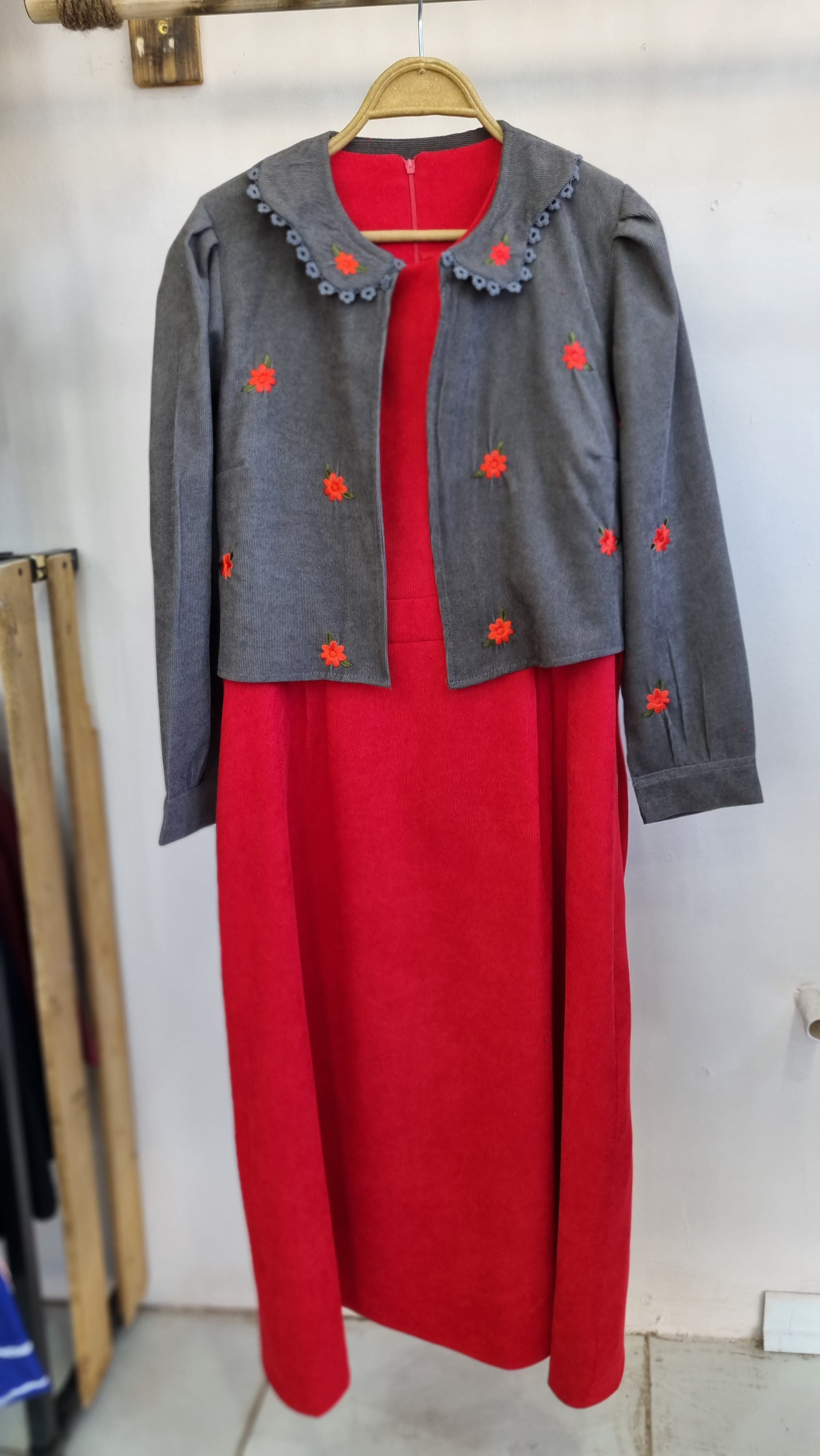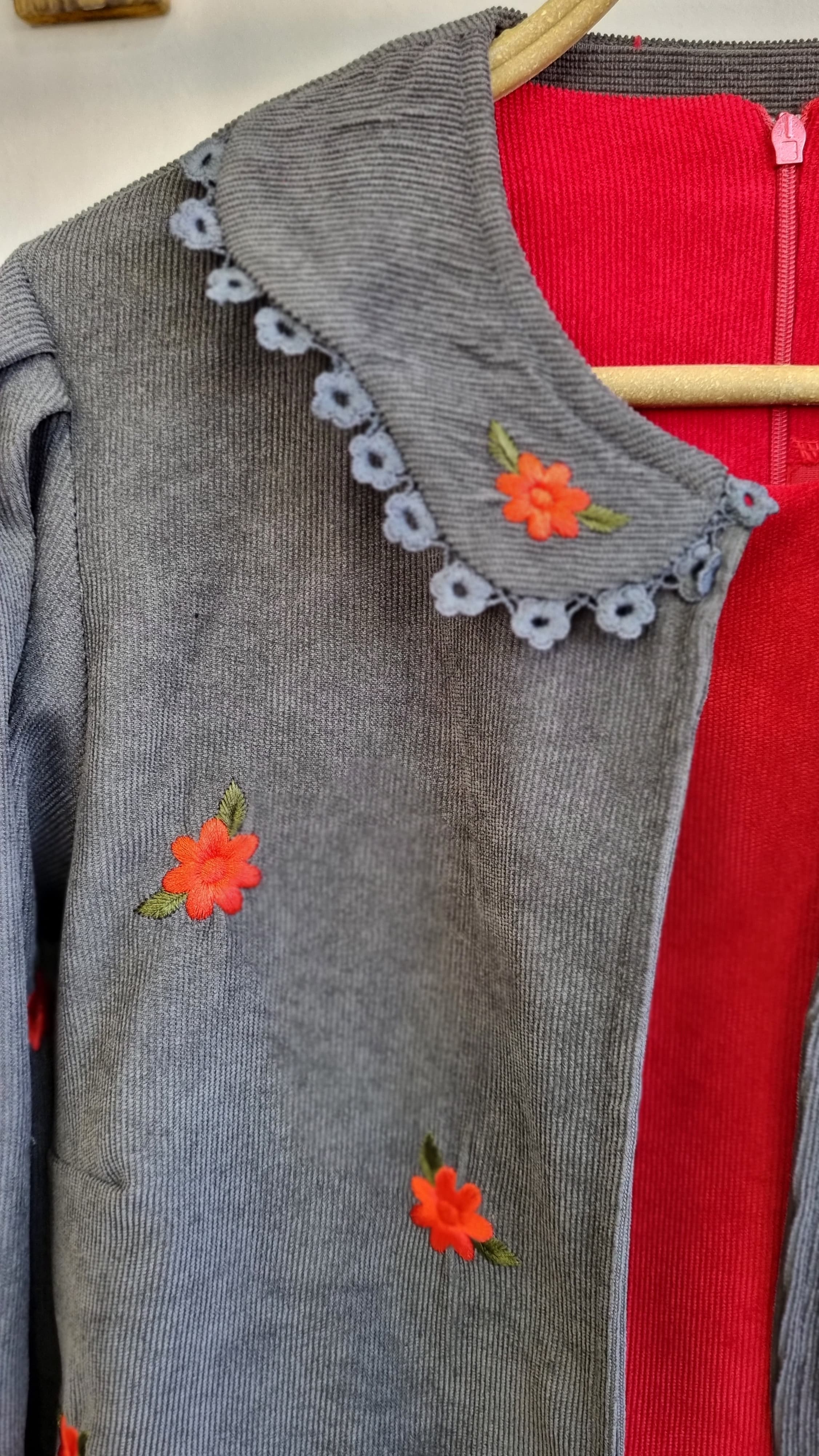جنس مخمل کبریتی ریز ، جلو سارافون کمری و پیله ، پشت سارافون زیپ مخفی و بندینک ، کت تماما گلدوزی شده ، یقه به به ، آستین عروسکی و دکمه خور ، دو سایز ، مناسب ۳۸ تا ۴۶ ، حتما قبل از ثبت سفارش جدول سایزبندی چک شود