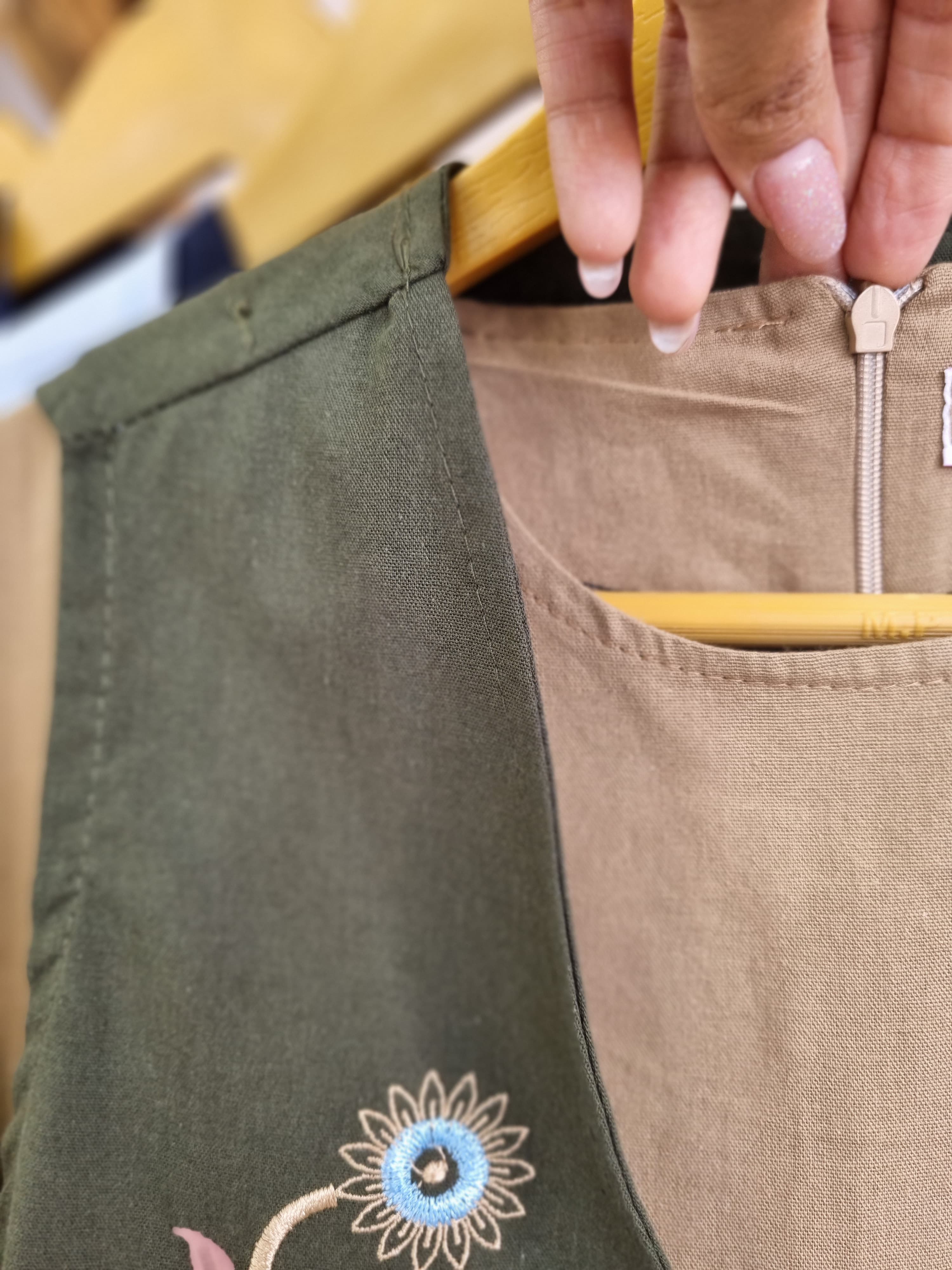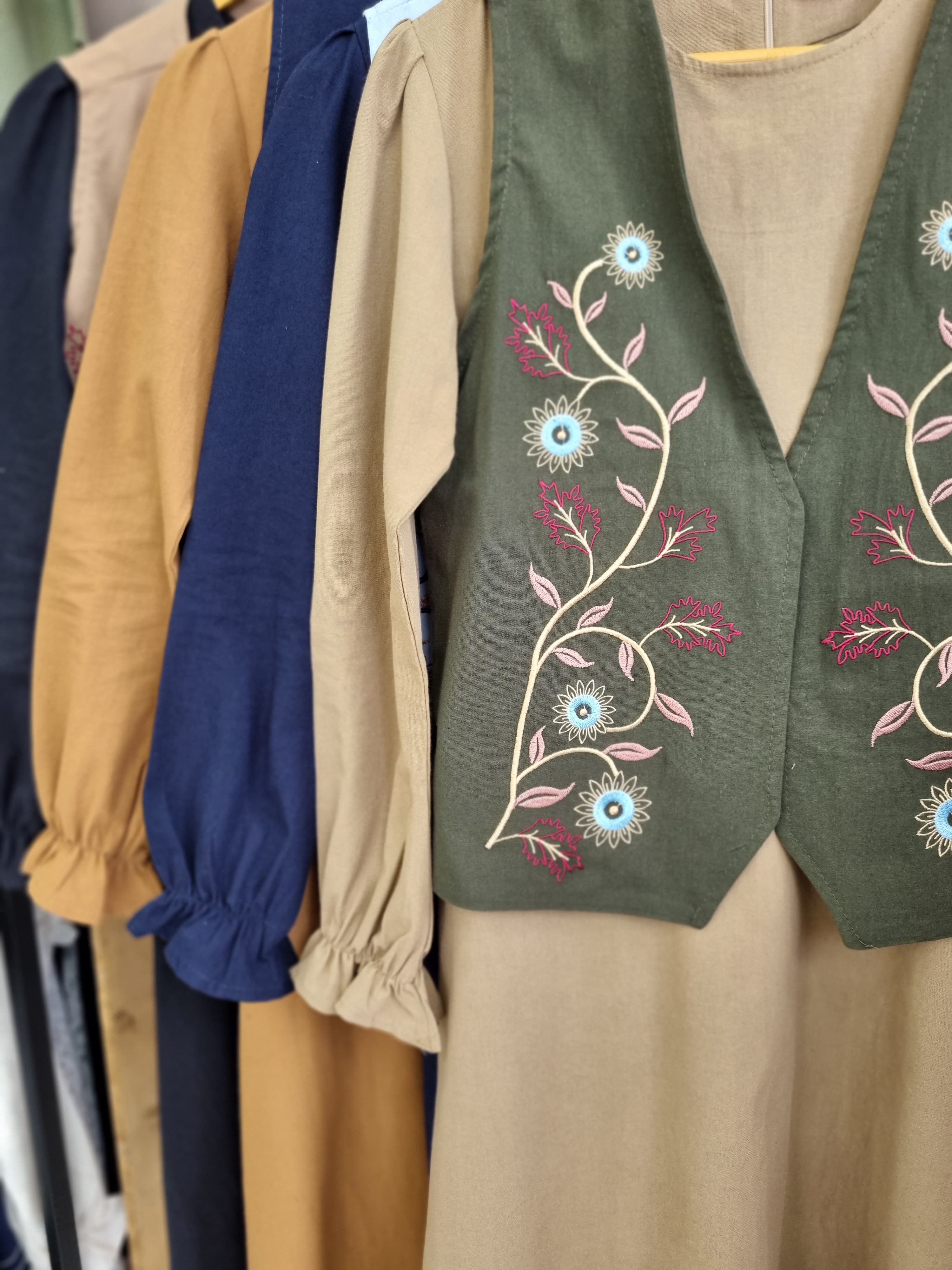 🌼جنس لینن ، پیراهن از پشت زیپ مخفی داره آستین هاش ساده و کش دوزی شده ، جلیقه گلدوزی شده ، ۴ سایز ، مناسب ۳۸ تا ۴۸ ❤️مناسب برای روزمره ، مهمونی ، و استایل های متفاوت