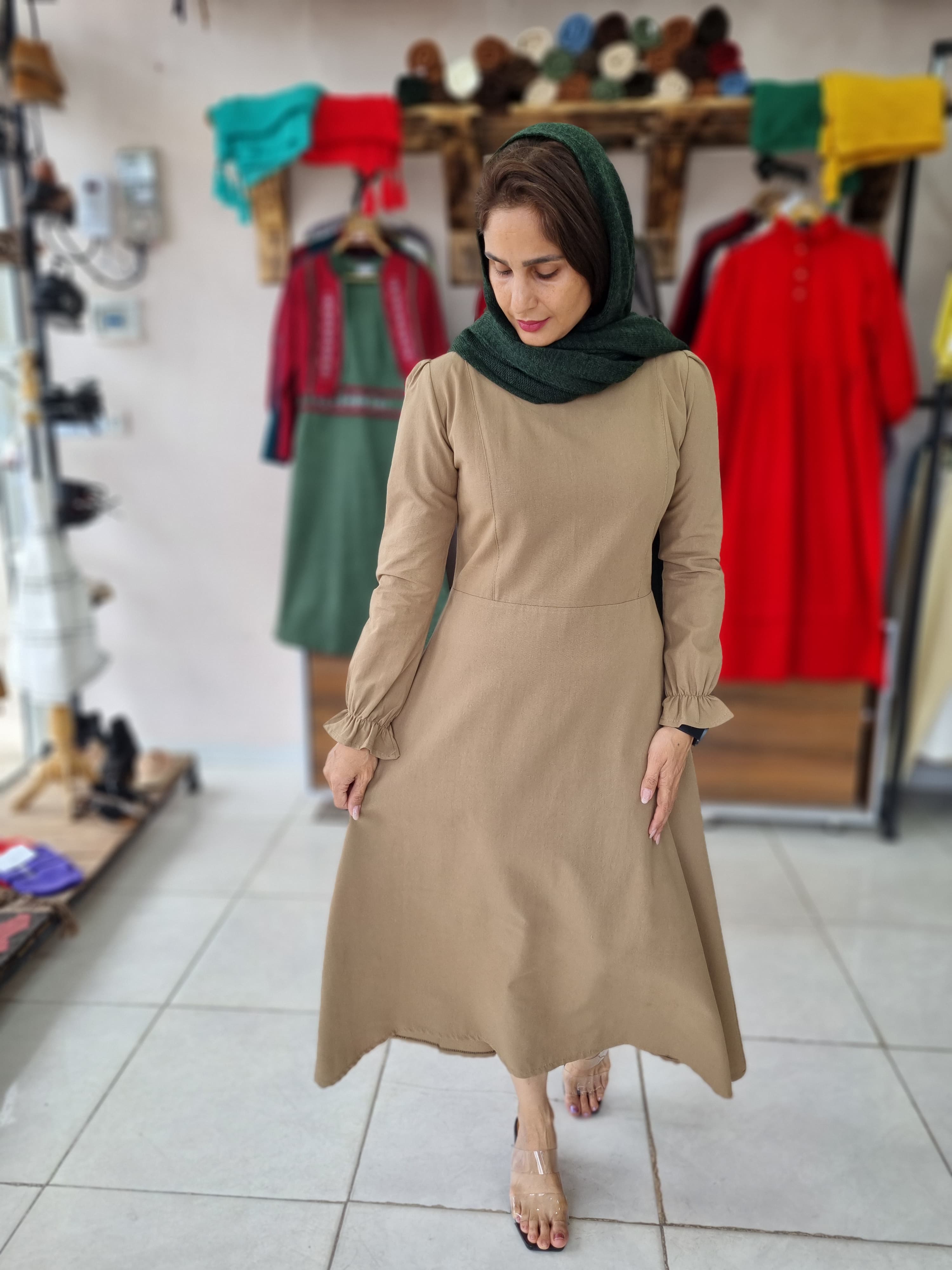 پیراهن : دور سینه ۱۰۲ ، دور کمر ۹۲ ، دور باسن ۱۲۰ ، قد ۱۲۰ ، قد آستین ۵۹ ، دور بازو ۳۸
